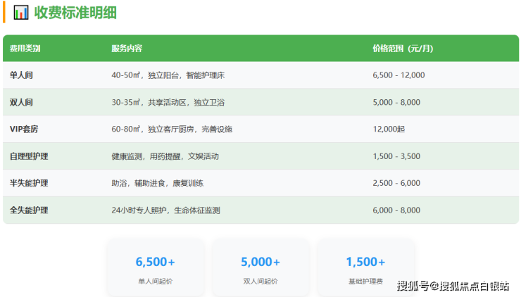 单人间:6500-12000元/月(面积40-50㎡,含独立阳台、智能护理床等)