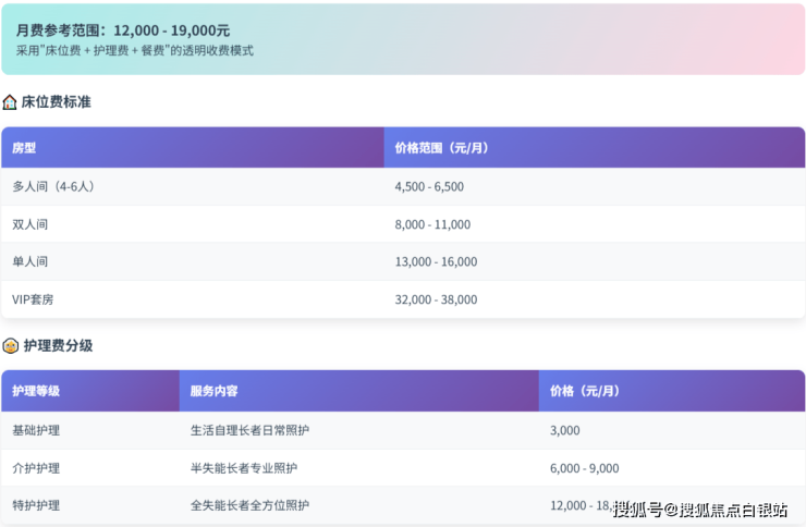上海人寿堂颐养院采用**"床位费+护理费+餐费"的透明收费模式**,月均费用区间为12000-19000元。下面为您详细分解各项费用构成:
