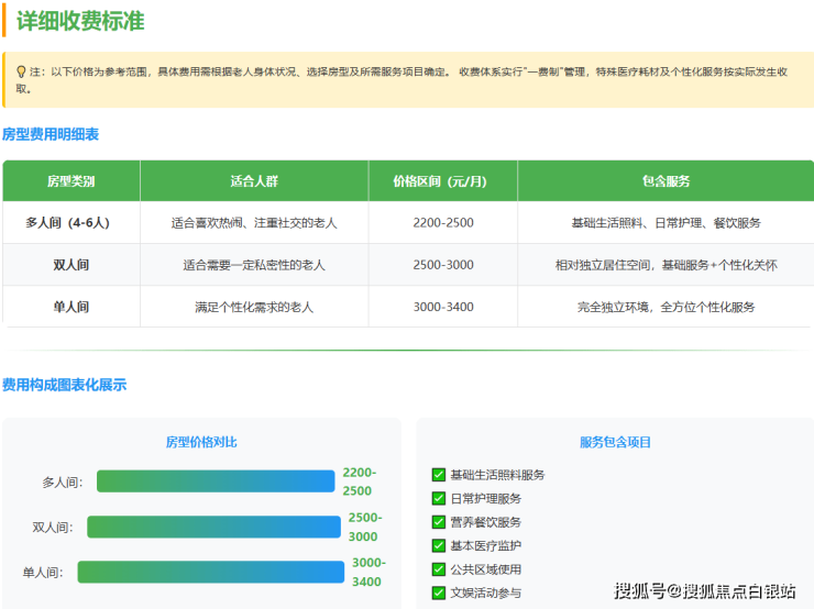 注:以上价格为参考范围,具体费用需根据老人身体状况、选择房型及所需服务项目确定。收费体系实行"一费制"管理,特殊医疗耗材及个性化服务按实际发生收取。