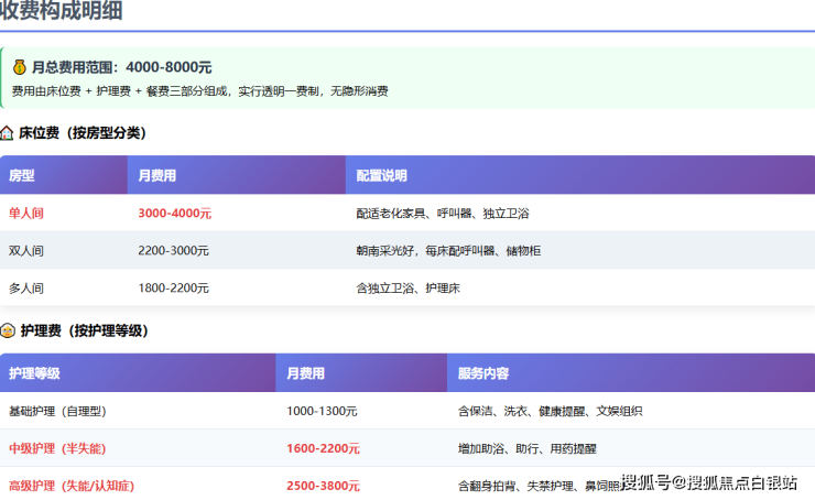 **综合计算示例:**一位选择标准双人间、经评估需半失能护理等级的长者,其月费用大致构成为:床位费2400元(取中值)+ 护理费2000元(取中值)+ 膳食费900元 = 约5300元/月。
