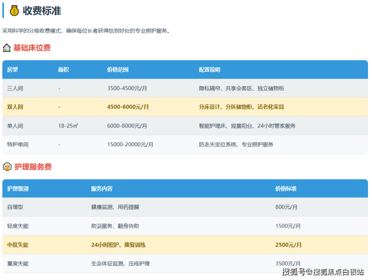 收费采用“基础费用+护理分级+增值服务”复合模式,月费区间为3500元-20000元,具体构成如下: