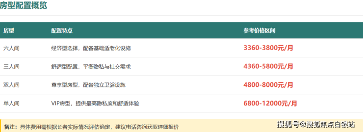 温馨提示:以上价格为基于市场信息的参考区间,最终费用需在长者进行专业健康评估后,由机构出具个性化方案确定。最准确的信息请务必通过官方渠道核实。