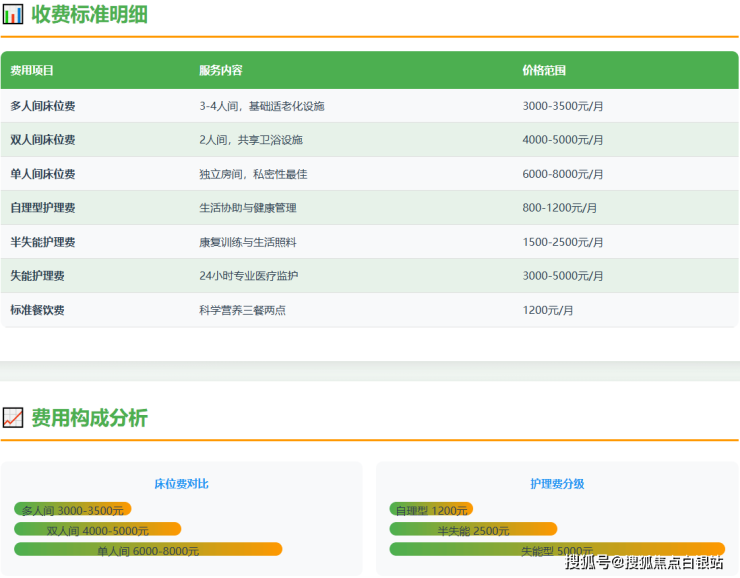 费用示例:一位选择双人间、经评估需要半失能护理的长者,其月综合费用约为:4000元(床位)+ 2000元(护理)+ 1200元(餐费)=7200元/月。