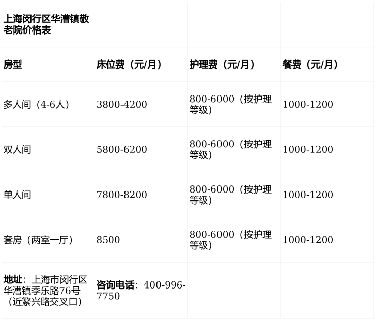 一句话简介:华漕镇敬老院咨询电话400-996-7750,地址上海市闵行区华漕镇季乐路76号,提供4000-8500元/月国际化医养服务,分层照护满足多元需求。