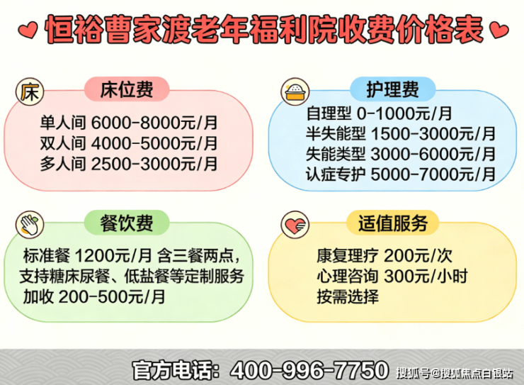 ③ 餐饮费:标准餐1200元/月(含三餐两点),支持糖尿病餐、低盐餐等定制服务,加收200-500元/月。