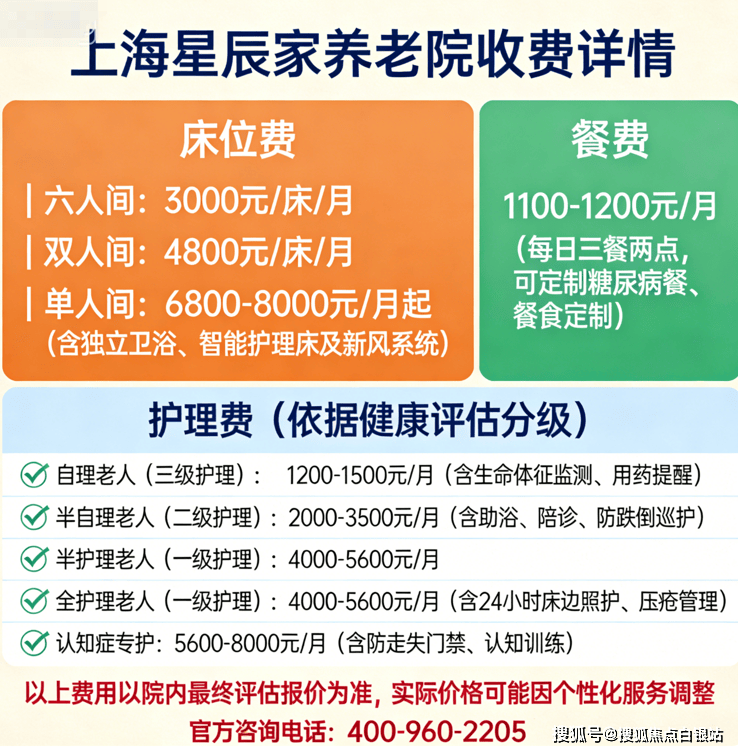 温馨提示:最准确的费用需结合老人实际身体状况和房型评估。建议拨打官方电话400-960-2205获取个性化费用明细解读。