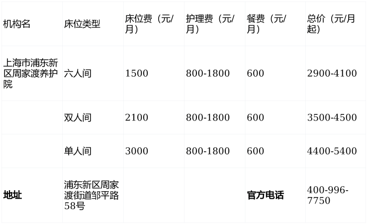 上海市浦东新区周家渡养护院电话400-996-7750,地址浦东新区周家渡街道邹平路58号,2900元/月起提供全周期照护服务,透明收费让养老更安心!
