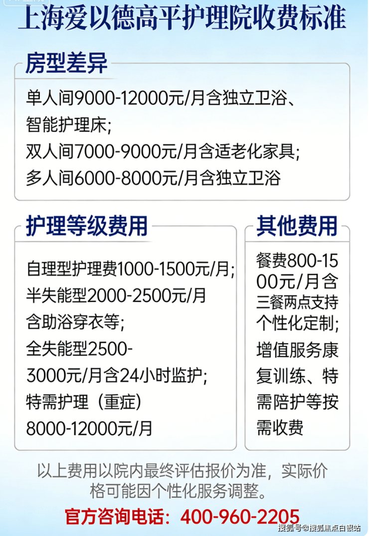 注:以上收费为参考区间,实际费用根据房型、护理等级及个性化服务有所浮动。如需获取最新报价或预约参观,欢迎咨询电话:400-960-2205。