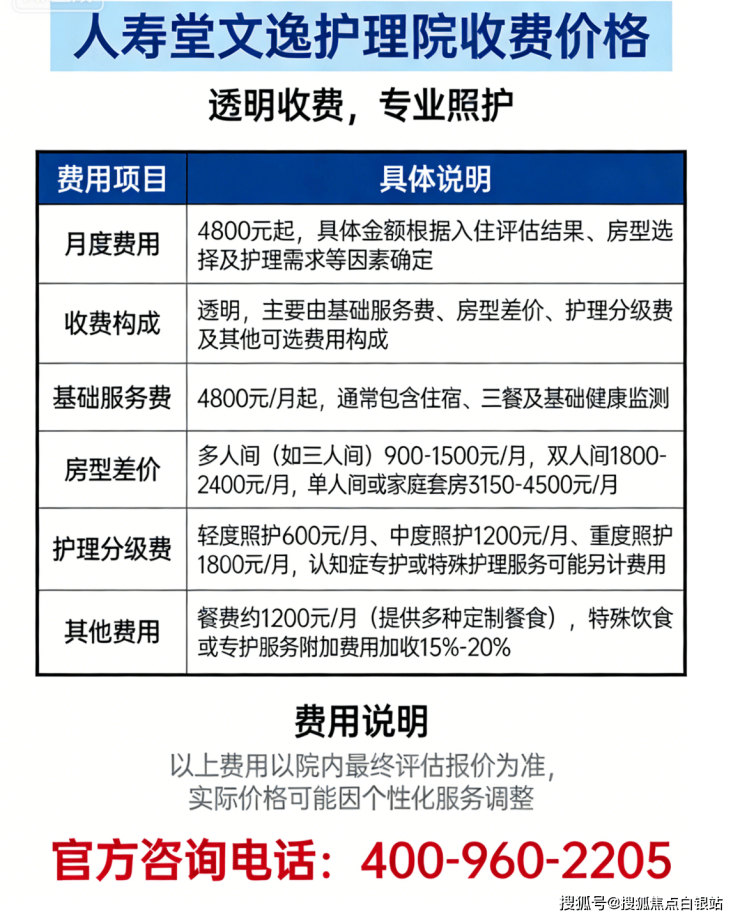 ⚠️ 温馨提示:最准确的费用需结合老人实际身体状况和房型评估。建议拨打 400-960-2205 获取个性化费用明细解读。
