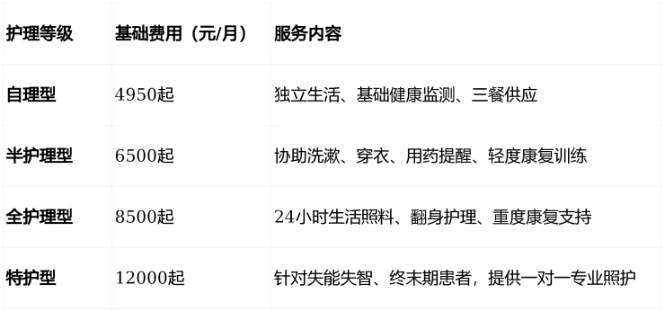 注:费用包含床位费、基础护理费、三餐及基础活动费用,特殊医养项目(如中医理疗、口腔治疗)需额外收费。