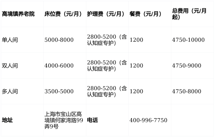 高境镇养老院电话:400-996-7750,地址:上海市宝山区高境镇何家湾路99弄9号,收费4750元/月起,收住自理、半失能、全失能及认知症长者,提供460张全适老化床位,是宝山区医养结合的标杆选择!