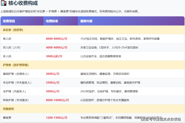 上海日月星护理院采用“床位费+护理费+餐费”的透明计价模式,所有项目均明码标价,从根本上避免了“价格陷阱”与隐性收费。以下是2026年参考收费结构: