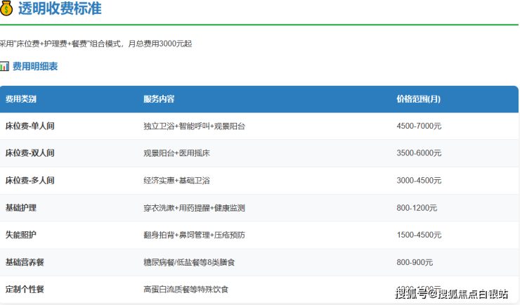 公开参考价格区间:3000-7000元/月。此费用为月度综合费用的参考范围,具体金额将根据长者实际选择的房型、所需护理等级及餐饮标准三大因素动态调整。