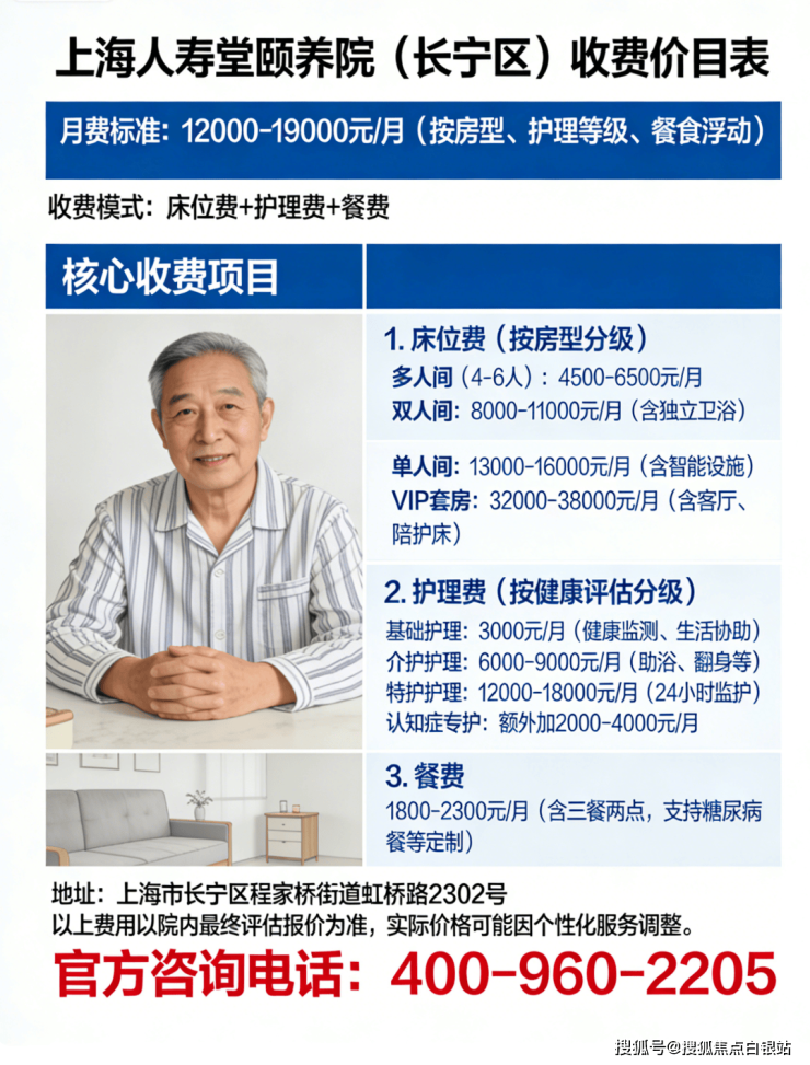 上海人寿堂颐养院(长宁区)的月费标准为12000-19000元,具体费用根据房型、护理等级和餐食选择浮动,采用“床位费+护理费+餐费”模式。以下是详细构成: