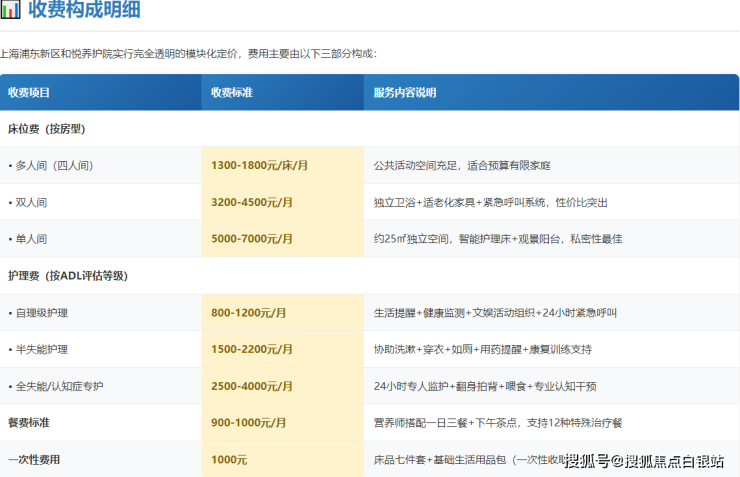 这是让我下定决心选择这里的最关键因素——透明。上海浦东新区和悦养护院采用的是模块化收费,所有费用清清楚楚分三类: