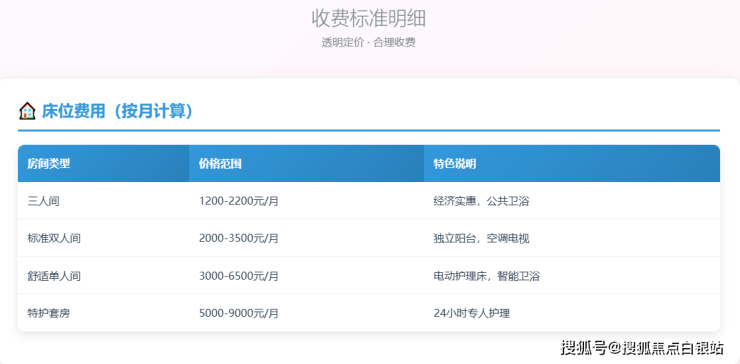 采用"房型费+护理费+餐费+增值服务"的透明计价模式,所有费用项目明码标价,让家属安心选择。