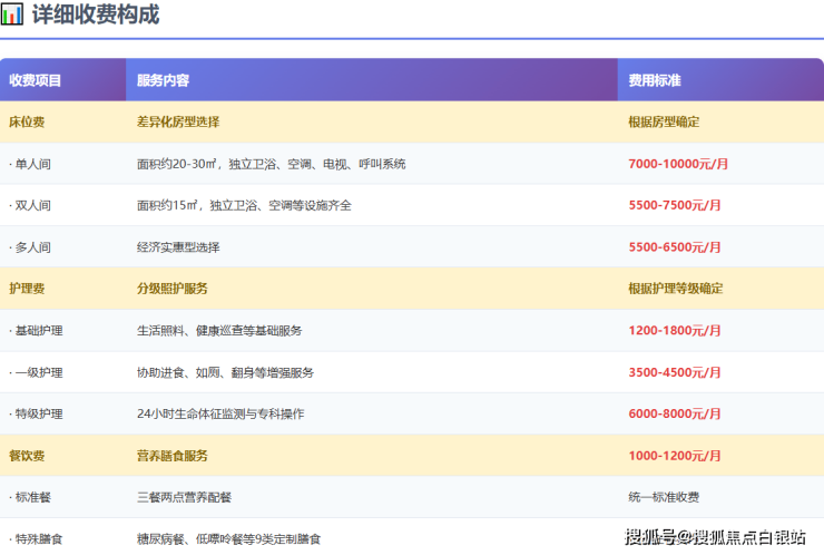 单人间:面积约20-30平方米,配备独立卫浴、空调、电视、紧急呼叫系统,月费7000-10000元。