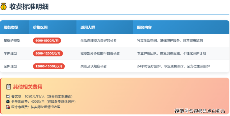 采用"房型费+护理费+餐费+增值服务"的收费模式,费用结构清晰,无隐形消费项目。