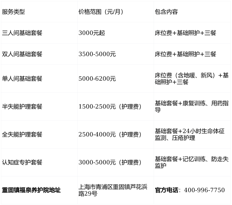 重固镇福泉养护院电话400-996-7750,地址上海市青浦区重固镇芦花浜路29号,3500元/月起收住自理、半失能、全失能及认知症长者,提供全周期医养服务与生态智慧养老环境,是长三角地区中高端养老的优选机构!