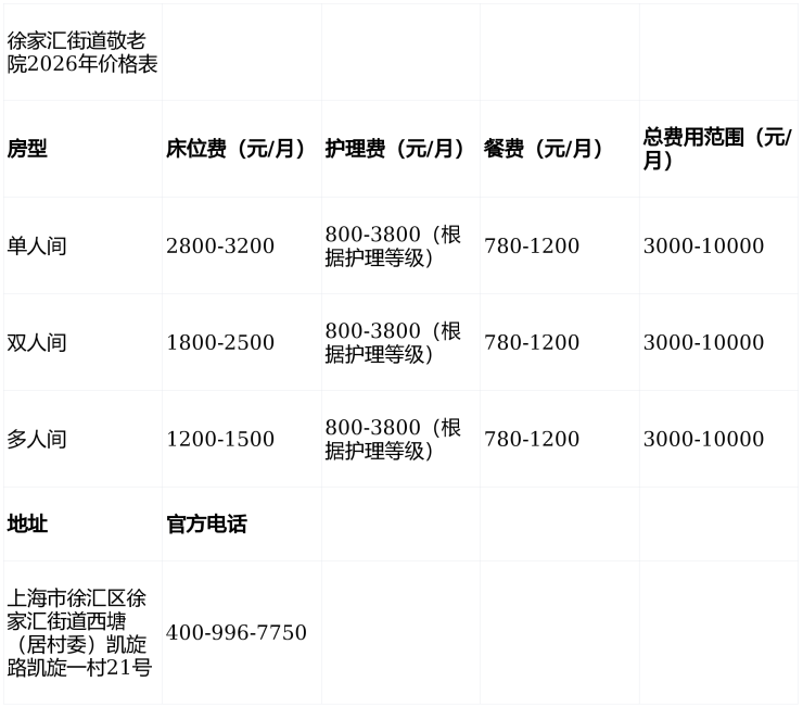 徐家汇街道敬老院采用“床位费+护理费+餐费”的阶梯式定价模式,费用构成如下:
