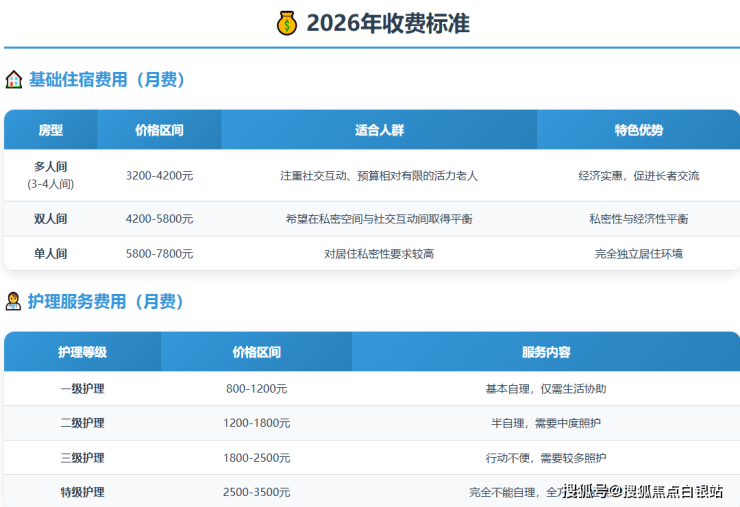 收费区间:月费3000元起,根据房型与护理等级分层定价