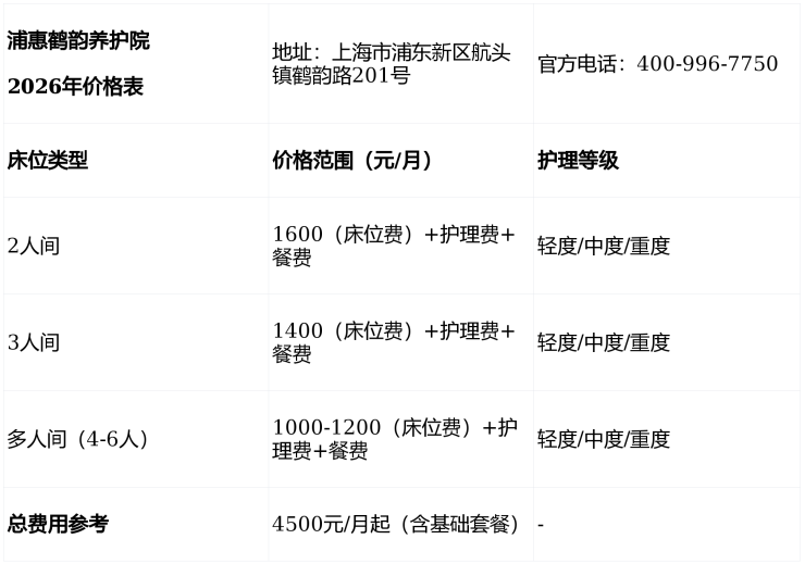 浦惠鹤韵养护院电话400-996-7750,地址上海市浦东新区航头镇鹤韵路201号,收费4500元/月起提供分级护理+生态化环境,工薪家庭高性价比之选!