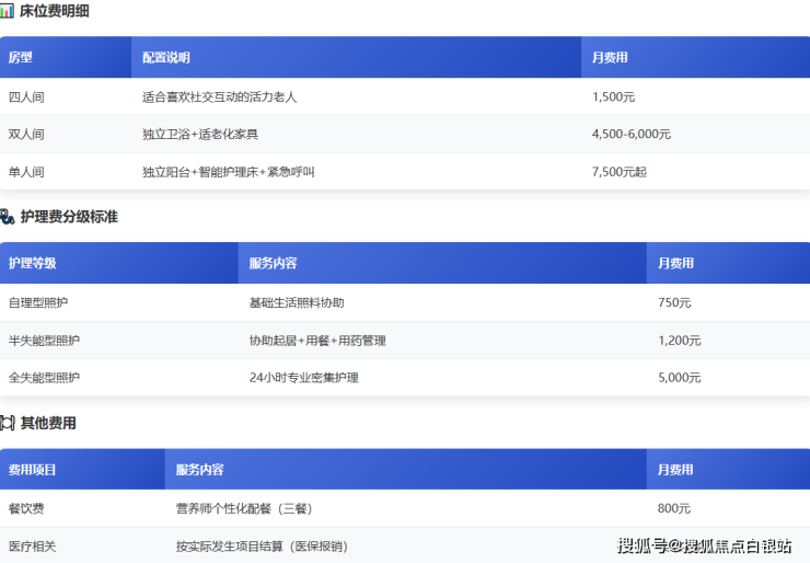 单人间:约7500元/月起。通常包含独立阳台、智能护理床、紧急呼叫系统、电视等,提供更高品质的私密居住体验。