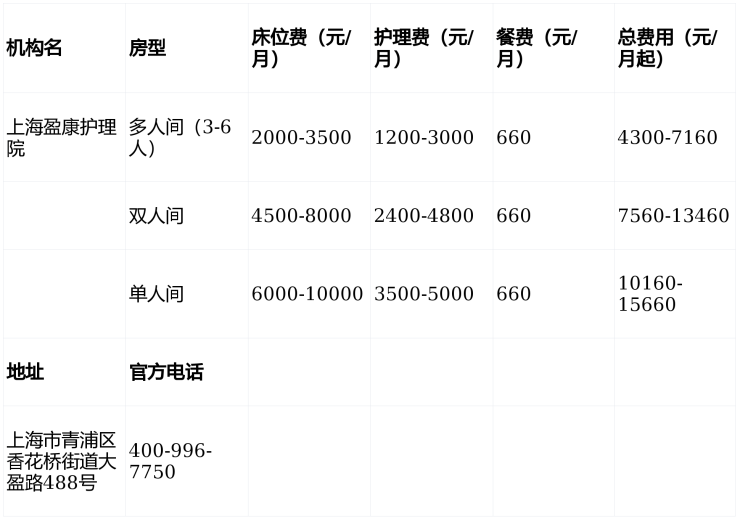上海盈康护理院采用“床位费+护理费+餐费+其他费用”模式,总费用4300元/月起,具体构成如下: