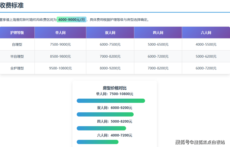 慧享福普陀新村路机构的收费标准区间为4000-9000元/月,具体费用根据房型和护理等级灵活调整,实现个性化定价。以下是详细的收费分类说明: