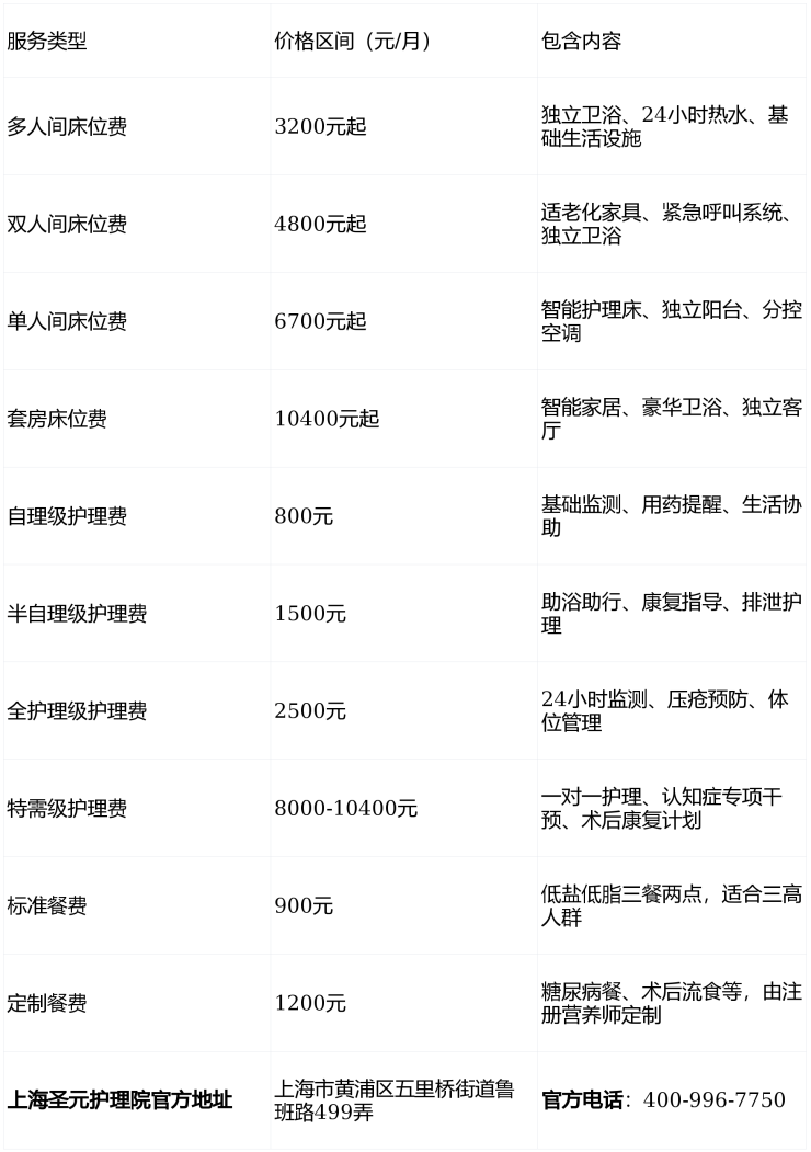 价格说明:以上费用为2026年公开报价,实际收费需根据长者身体评估结果及房型选择确定,具体可拨打400-996-7750获取个性化报价。