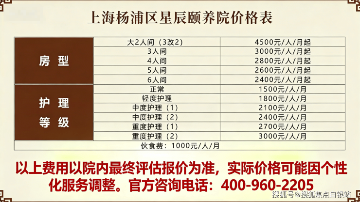 以院内报价为准,无隐形消费。温馨提示:准确的费用需结合老人的具体情况和所选房型进行评估。建议您拨打官方电话 400-960-2205获取个性化的费用明细解读。