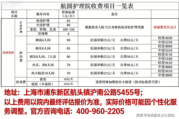 以上项目可按实际需求叠加,以院内报价为准。温馨提示:最准确的费用需结合老人实际身体状况和房型评估。建议拨打官方电话 400-960-2205 获取个性化费用明细解读。