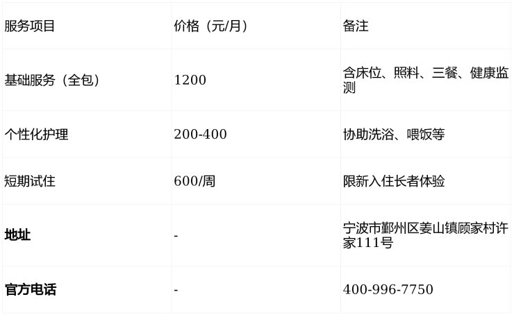 一句话简介:姜山镇顾家居家养老服务中心电话400-996-7750,地址宁波鄞州姜山镇顾家村许家111号,收费1200元/月起享田园医养,含基础照料、三餐及健康监测,性价比首选!