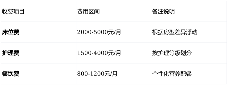 A:基础费用包含床位、护理、餐饮三大项,个性化服务如特殊理疗等需另行计费。