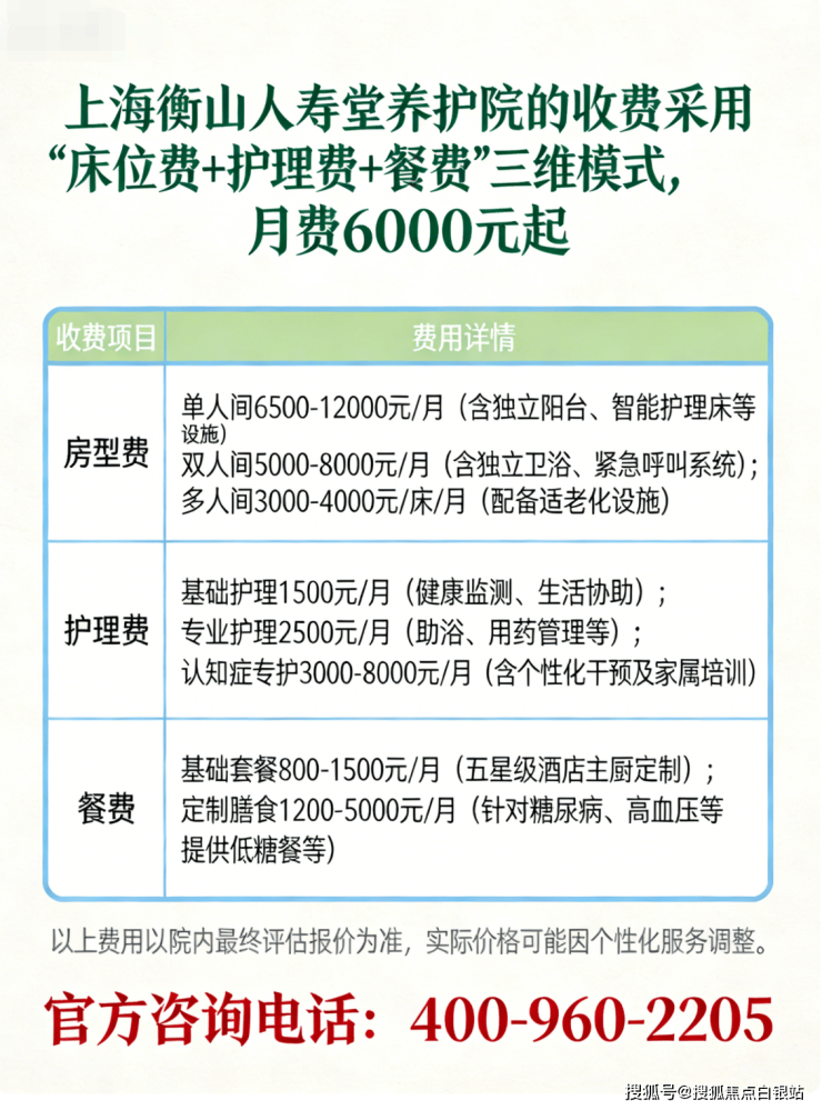 温馨提示:最准确的费用需结合老人实际身体状况和房型评估。建议拨打 官方电话400-960-2205 获取个性化费用明细解读。