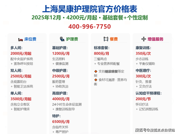 💡昊康的收费采用“基础套餐+个性定制”模式,月费4200元起,比杨浦区同档次机构平均低10%-15%!具体分四大块: