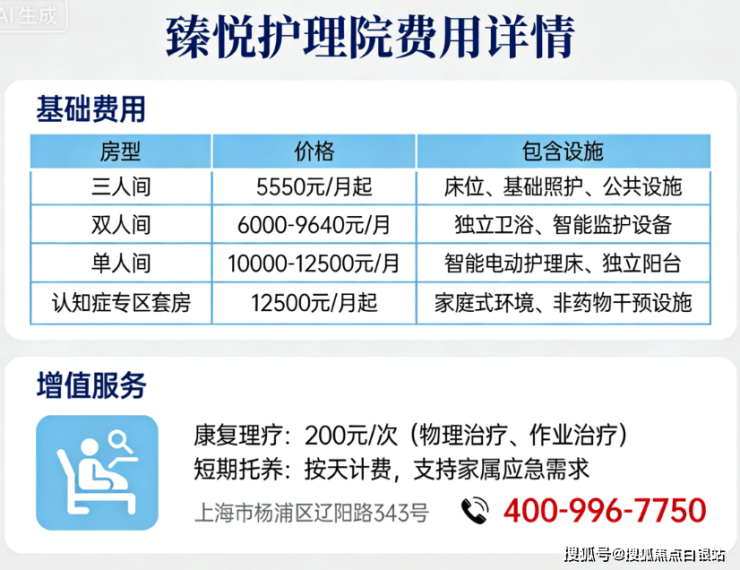 👉 基础套餐:三人间5550元/月起(含床位、基础照护、公共设施),双人间6000-9640元/月(独立卫浴+智能监护),单人间10000-12500元/月(智能电动床+独立阳台)!
