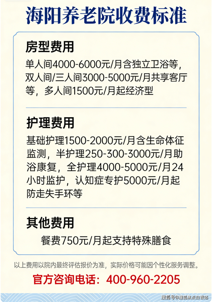 温馨提示:最准确的费用需结合老人实际身体状况和房型评估。建议拨打官方电话400-960-2205获取个性化费用明细解读。