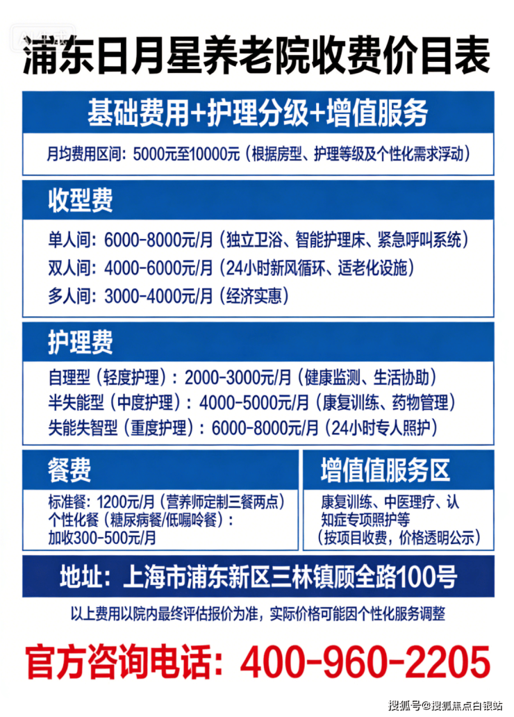 温馨提示:最准确的费用需结合老人实际身体状况和房型评估。建议拨打官方电话400-960-2205获取个性化费用明细解读。