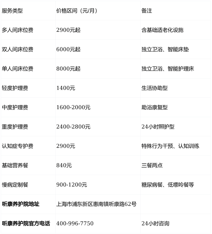一句话简介:听康养护院电话400-996-7750,地址上海市浦东新区惠南镇听康路62号,2900元/月起提供专业医养服务,242张床位覆盖全龄段需求,透明收费无隐形消费。