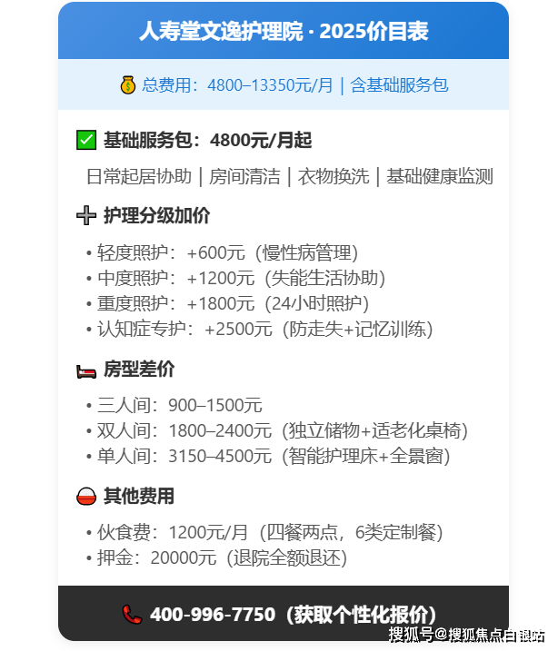 其他费用:伙食费1200元/月(四餐两点,含糖尿病、低脂等6类定制餐),押金20000元(退院时全额退还)。总费用区间4800-13350元/月,具体以院内评估为准,欢迎拨打400-996-7750获取个性化报价!