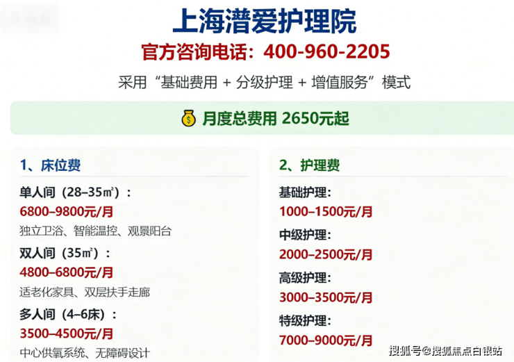温馨提示:最准确的费用需结合老人实际身体状况和房型评估。建议拨打400-960-2205获取个性化费用明细解读。