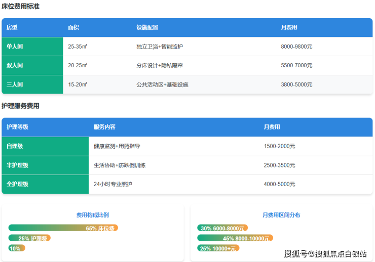 银港护理院采用"床位费 + 护理费 + 餐费 + 服务费"的模块化收费模式,杜绝隐形消费。总费用6000元/月起,具体构成如下:
