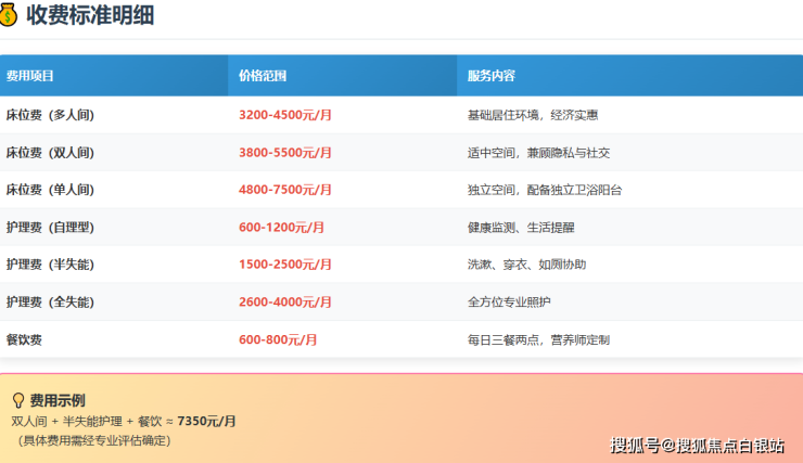 重要提示:以上价格为参考区间,具体费用需根据长者实际评估结果及所选服务内容最终确定,所有费用明细均通过正规合同确认,院内公示无隐性收费。