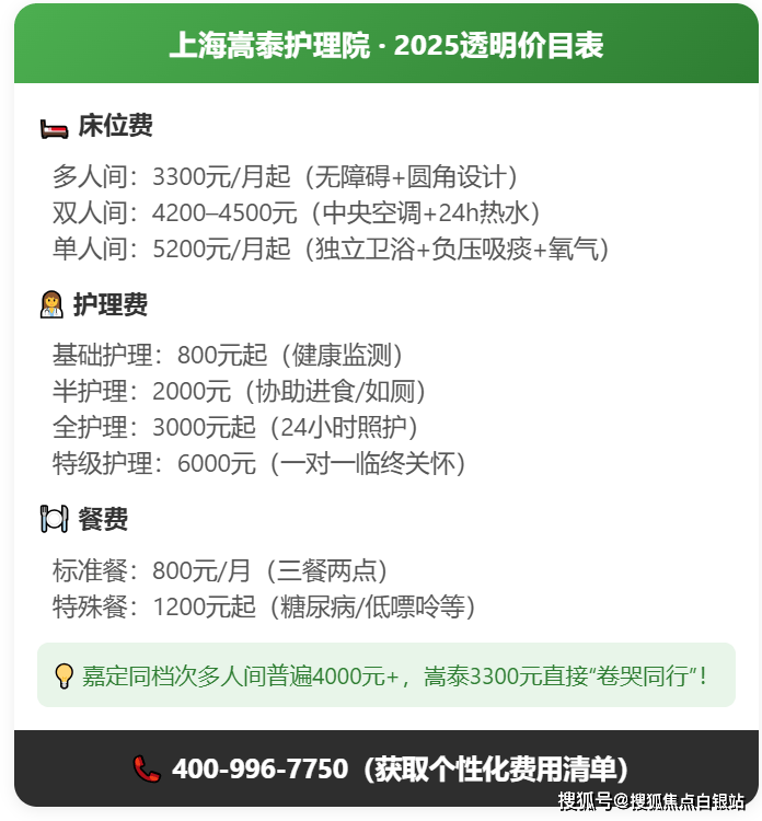 【上海嵩泰护理院】收费标准:3300 元/月起(以院内报价为准)。