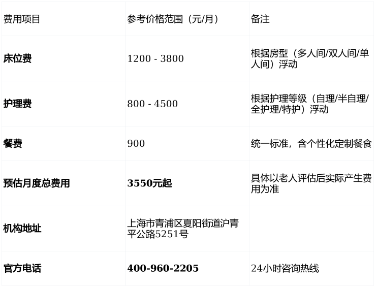 温馨提示:最准确的费用需结合老人实际身体状况和房型评估。建议拨打官方电话400-960-2205获取个性化费用明细解读。