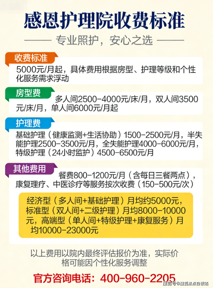 温馨提示:最准确的费用需结合老人实际身体状况和房型评估。建议拨打 官方电话400-960-2205 获取个性化费用明细解读。