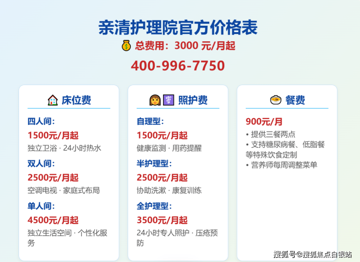 我们实行“床位费+照护费+餐费”三级模式,总费用3000元/月起,具体如下: