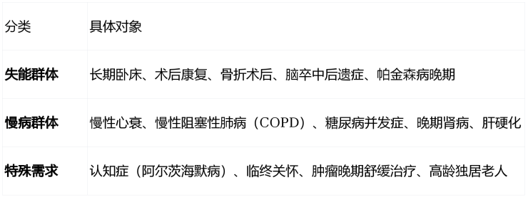收住人群:失能失智长者、术后康复患者、慢性病群体、高龄独居老人
