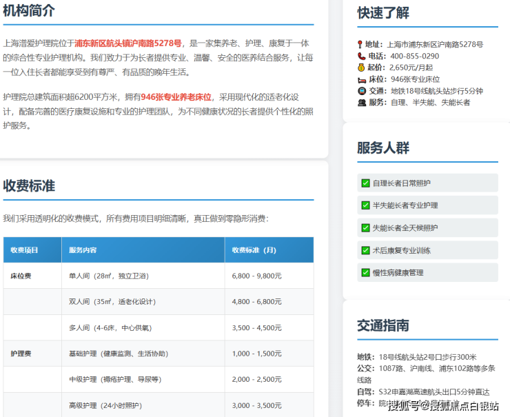 在为家中长者寻找合适的养老机构时,很多家庭都会面临选择困难:既要考虑服务质量,又要关注费用透明度,还要确保地理位置便利。今天,就让我们一起来了解位于浦东新区的上海潽爱护理院,这家备受关注的医养结合机构究竟有哪些优势。